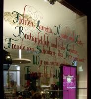 Sie wollen Aufmerksamkeit auf Ihr Geschäft lenken? Oder suchen eine besondere Attraktion für Ihre Veranstaltung? Nutzen Sie meine einzigartige Fähigkeit als Beidhänder, Ihr Schaufenster oder andere Glasflächen spiegelverkehrt mit Text zu gestalten, sodass die Menschen auf der anderen Seite ihn lesen können..